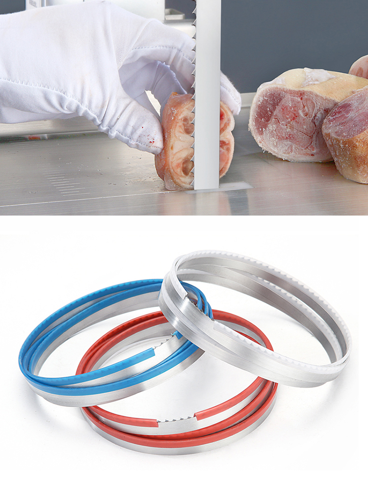 Band saw Blades for cutting fresh meat with bone, meat and frozen fish, carcasses. Made in carbon steel with hardened teeth tips.